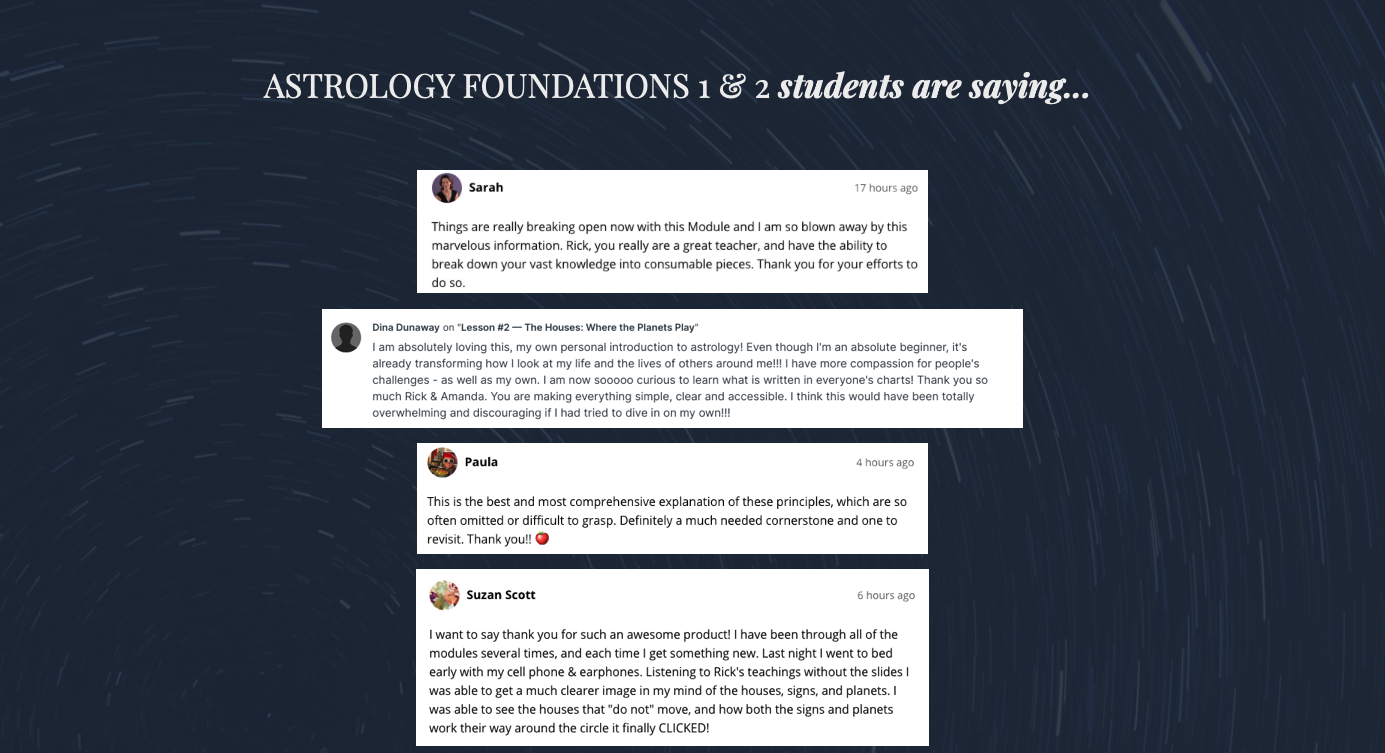 In four pre-recorded modules and two live sessions with Rick including chart-reading demonstrations and a Q&A (that’s 10 hours of material!), you’ll get a complete overview of harmonic aspects that will change the way you look at astrology forever.
